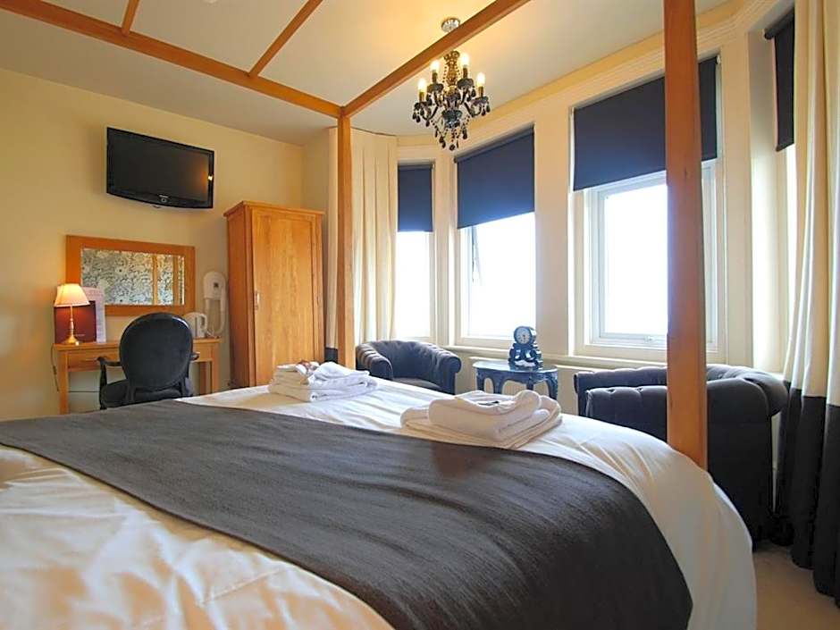 Spacious, front sea view room with four-poster bed. The room features solid Spanish oak furniture and boutique designer style decor. There is Italian floor-to-ceiling tiling in the bathroom with a full sized bath and shower over.